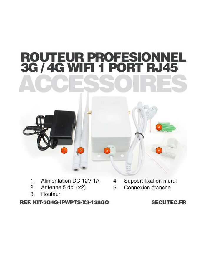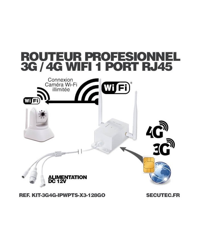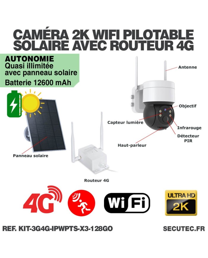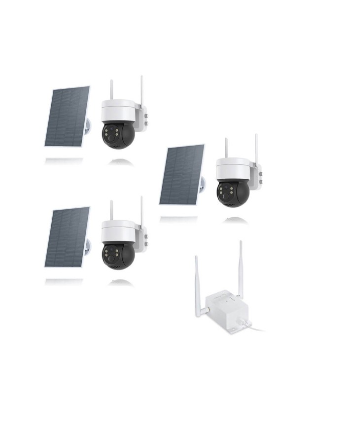 Kit composé de 3 caméras pilotables solaires IP Wi-Fi UHD 2K et d'un routeur 3G/4G industriel, idéal pour surveiller une maison, un bâtiment ou une résidence secondaire ou il n'y a pas de connexion par box internet.
