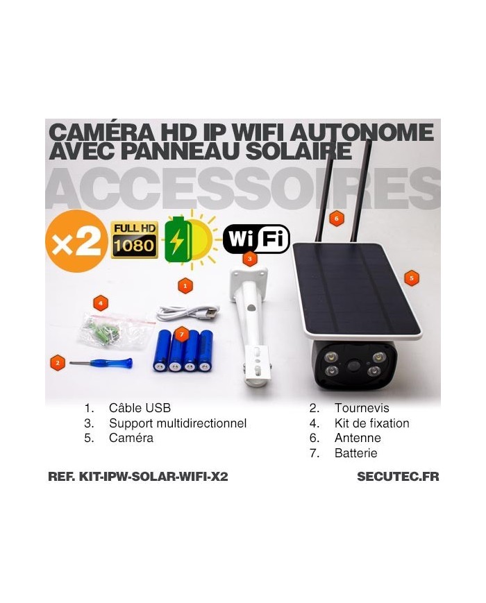 Kit de 2 caméras autonomes solaires Wifi de vidéosurveillance HD 1080P waterproof, communication IP sans-fil WIFI, connexion simplifiée P2P, vision nocturne LED IR ou LED blanche jusqu'à 10 m de portée, accès à distance depuis un smartphone / Tablette (iPhone) iOS / Android, Enregistrement vidéo manuel ou a la détection de mouvement par détecteur PIR jusqu'à 10 mètres de portée, Enregistrement sur carte micro SDHC jusqu'à 64 Go de mémoire (incluse) ou serveur cloud, Alerte temps réel par notification push en cas de de détection de mouvement, fonctionne sur batterie rechargeable via le panneau solaire intégré.