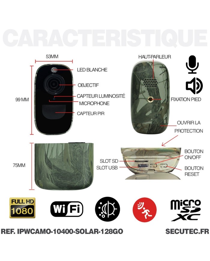 La smart caméra camouflage solaire est discrète et de petite taille soit 100×80×54 mm et peut être placé à l'intérieur comme à l'extérieur grâce à sa protection IP 65, elle vous permettra de protéger ce qui compte le plus pour vous (maison, bureau, entrepôt, garage, appartement ...) de jour comme de nuit (vision nocturne par infrarouge 940 nm jusqu'à 10 mètres de portée) depuis votre smartphone / tablette connecté à internet.